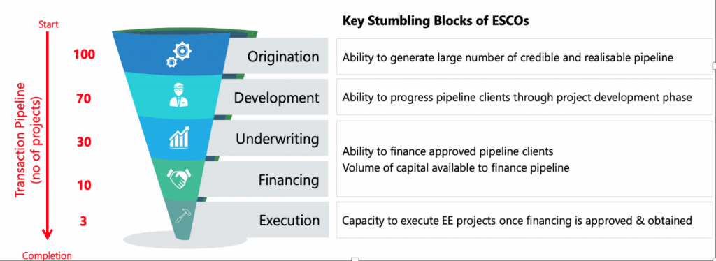 Energy efficiency implementation has as a result lagged behind, and millions of dollars of attractive energy-saving investment has been locked away. The process of taking an energy project to execution would involve 5 steps as shown in the figure below. Each of these steps has its stumbling block.